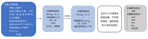 本研究是一项单臂、II期、多中心临床试验(NCT04609176),旨在评估卡瑞利珠单抗联合阿帕替尼和SOX一线治疗产甲胎蛋白胃/胃食管结合部腺癌患者的抗肿瘤活性、安全性及生物标志物变化。主要终点是基于RECIST v1.1确认的ORR。次要终点包括DCR、PFS、OS、缓解持续时间、缓解时间及安全性等。